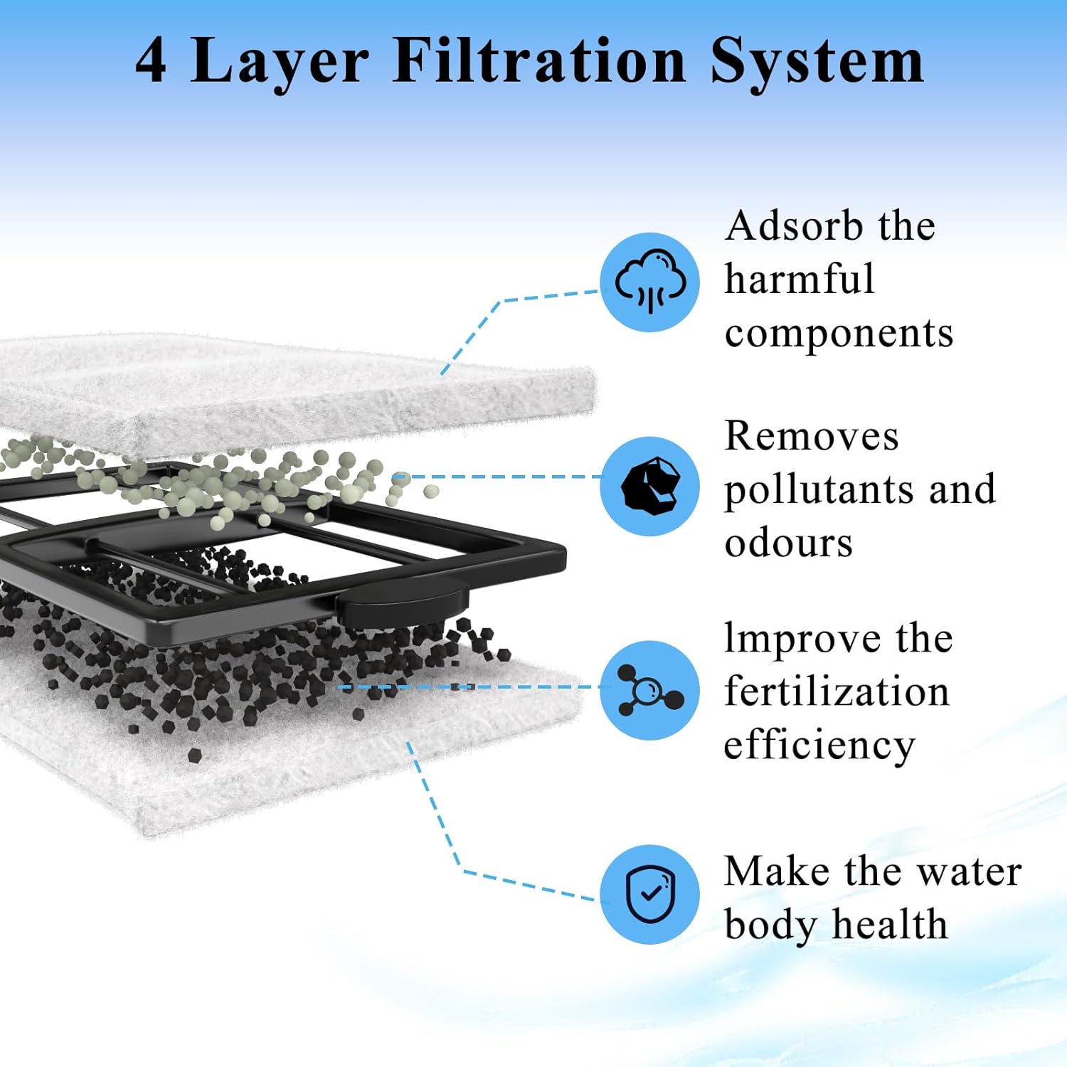 Four-Stage Filtration: The filter is made of dense dual-sided mesh, Better thickness provides better filtration, Ultra-Activated carton instead of ordinary carton and also add processed zeolite, which can effectively filter and absorb impurities in the water to keep the clean water source and provide the healthy growth environment for fish