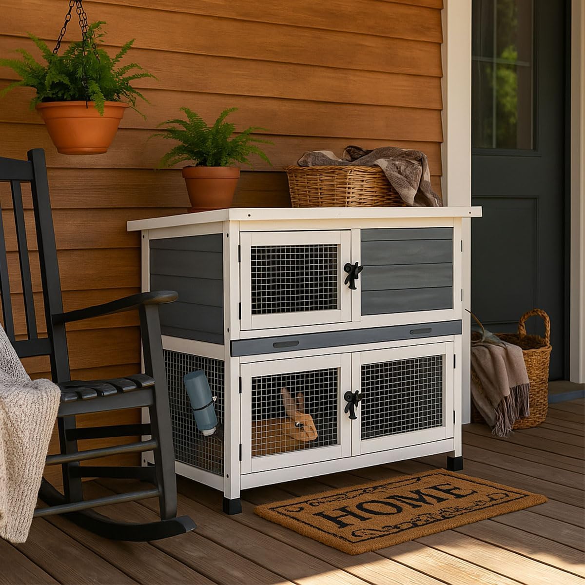8 reviews for 2 Story Solid Wood Rabbit/Bunny Hutch with 2 Large Main Rooms, Indoor Outdoor Rabbit House Guinea Pig Cage Pet House for Small Animals with Ventilation Door Removable Tray Waterproof Roof (Grey)