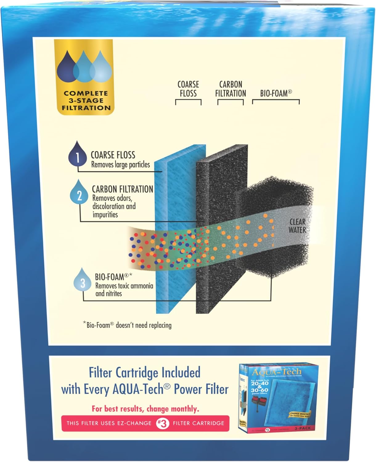 Aqua-Tech Ultra Quiet Power Filter is your answer to keeping aquarium water pristine without the fuss. Our complete 3-stage filtration system provides coarse floss to remove large particles from aquarium water; carbon filtration to remove odors, discoloration and impurities; and Bio-Foam biological filtration to remove toxic ammonia and nitrites on contact. To ensure crystal-clear aquarium water, change the filter cartridge once a month, as carbon deactivates with use.Even with a decoupled motor running at less than 40 dB, this filter makes no sacrifices when it comes to power. Our impeller and motor assembly designed for efficient power usage filters a whopping 200 gallons per hour – completely filtering 20- to 40-gallon aquariums 5 times per hour. This filter uses the Aqua-Tech EZ Change #3 Filter Cartridge with Premium Activated Carbon. Aqua-Tech Filter Cartridges trap dirt, remove impurities and deliver maximum water-to-carbon contact to make your aquarium water sparkle. Designed to fit standard aquarium hoods and canopies, the Aqua-Tech Ultra Quiet Power Filter is a sophisticated filtering process made easy. Whatever your individual needs, Aqua-Tech products help make aquarium maintenance simple for a clean and beautiful aquatic environment.