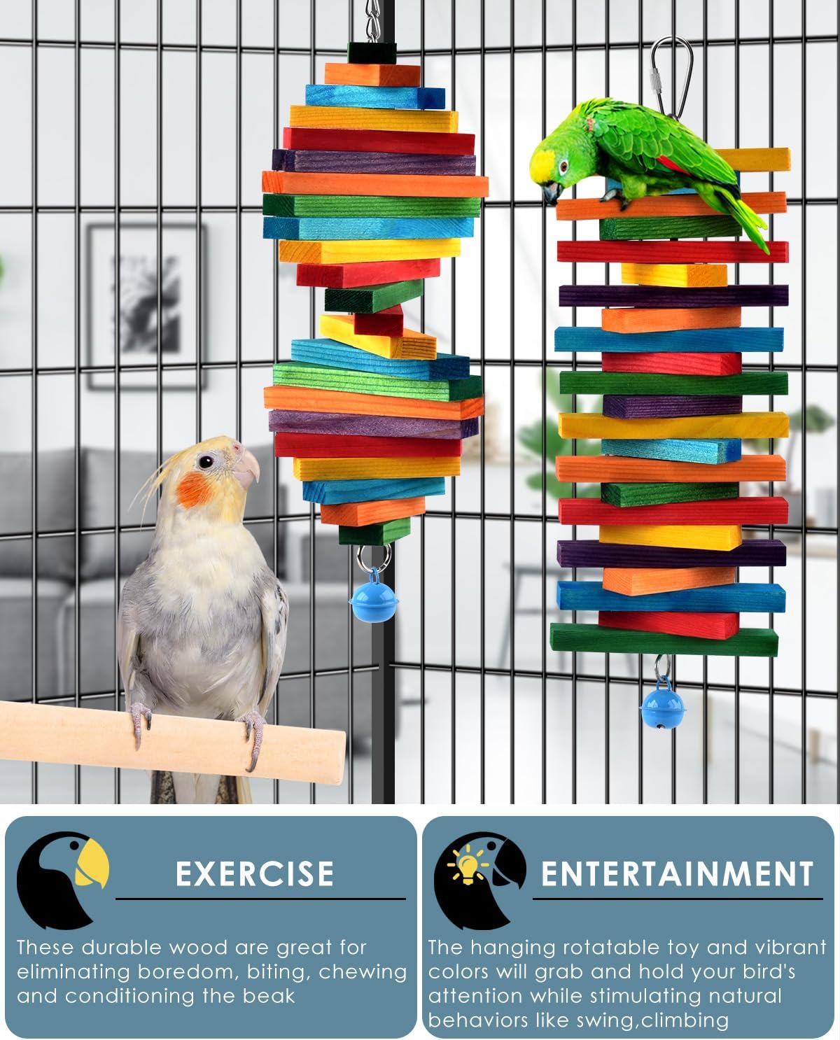Unique Design: Featuring a variety of distinctive shapes and brightly colored wooden blocks connected with metal chains, medium bird toy also includes multiple layers to encourage climbing and exploration. These engaging jumping and climbing blocks will keep your bird entertained for hours