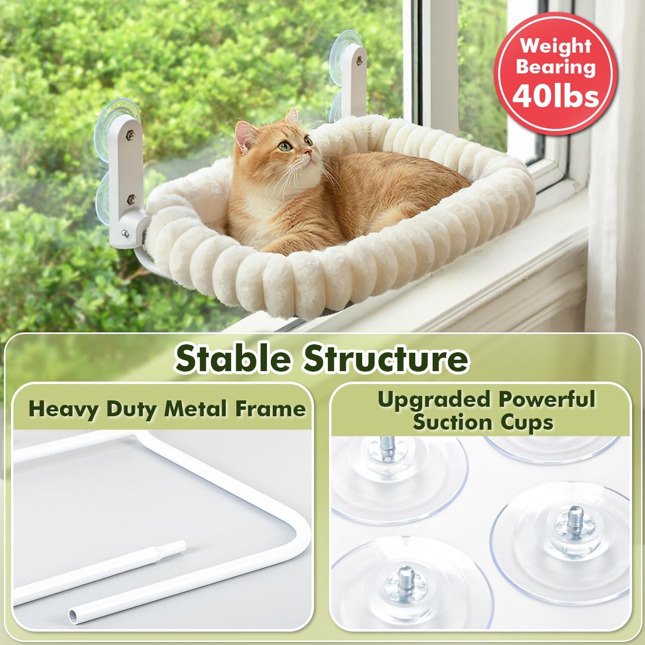 Cat Window Perch with Bolster, Cordless Foldable Cat Window Hammock with Strong Suction Cups & Metal Frame, Machine Washable Pet Bed for Indoor Cats (White, Medium)