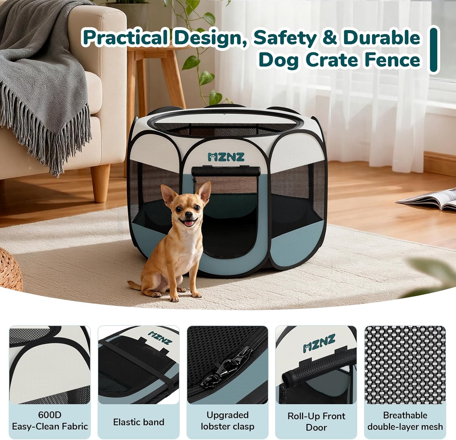 Durable & Breathable Materials for Long-Lasting Use: Crafted with high-grade chew-resistant thick mesh and waterproof 600D polyester Oxford cloth, MZNZ puppy playpen stand up to daily use. Reinforced seams and corners prevent tearing, enhancing the enclosure’s sturdiness—ideal for energetic puppies. Equipped with 8 mesh sides and a half-mesh top offer superior ventilation while letting you keep a 360° eye on your pet, reducing their anxiety.