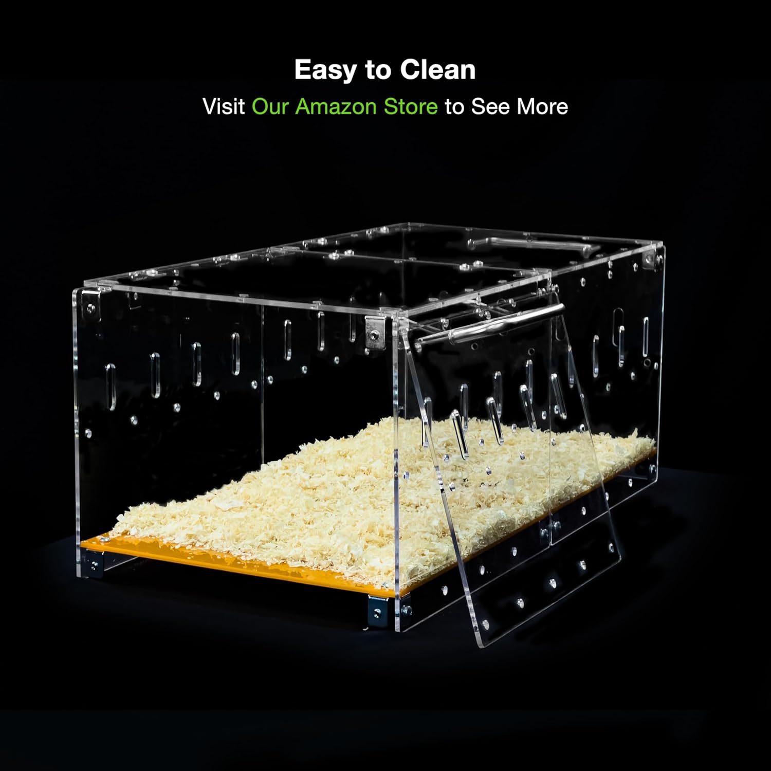 The Model-P3 cage is a fully enclosed unit featuring a thick, fully openable acrylic lid and a fixed bottom. Every part is chew-proof and escape-proof. The lid flips open effortlessly, providing convenient access for feeding, cleaning, and interaction, and can be securely locked using our thumb screws.
