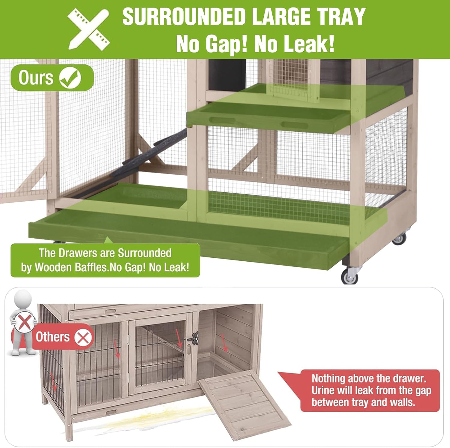 Easy to Clean Trays: Bunny hutch Includes two pull-out leak-proof trays for quick, mess-free cleaning, keeping the hutch cleaning effortlessly
