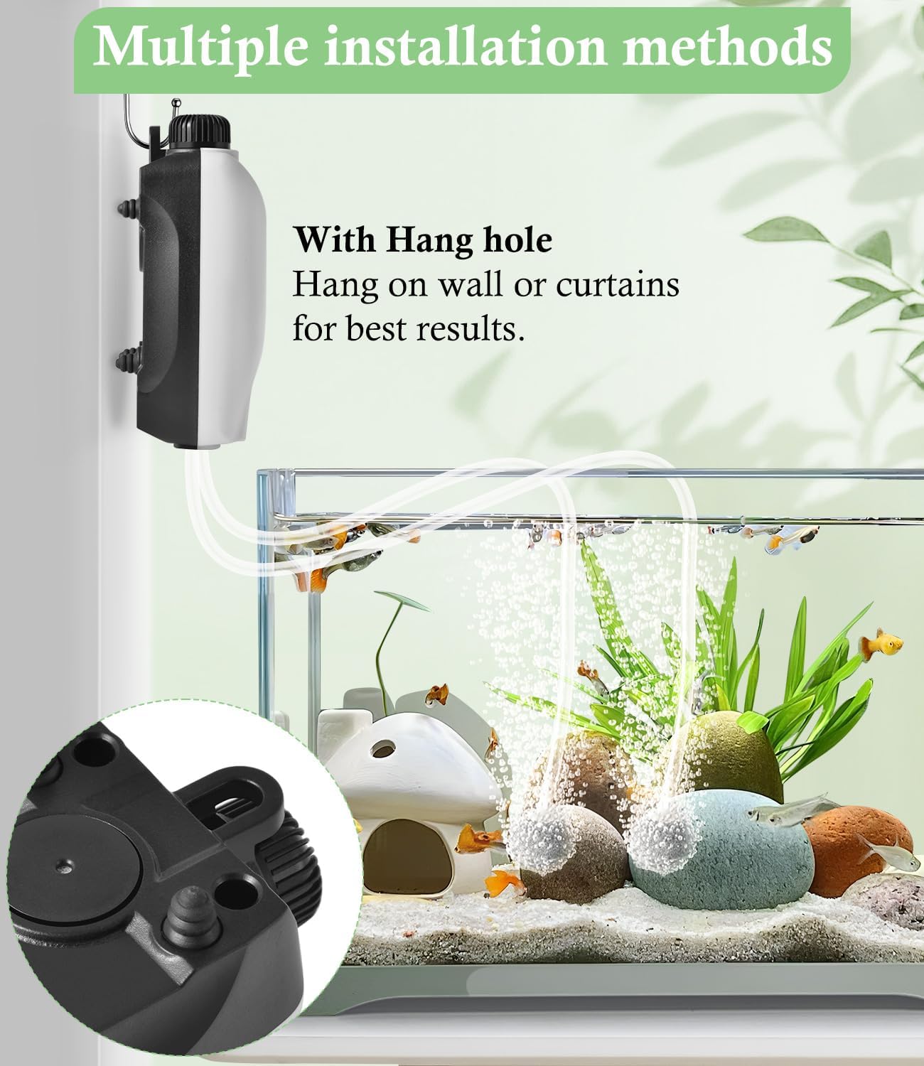 Multiple Installation Methods: Small in size, this nano air pump is very easy to be placed anywhere near the fish tank. Equipped with hang hole, the pump can also be hung on the wall or curtains. Note: not recommend to hang it on the glass of the fish tank, and no hooks are included.