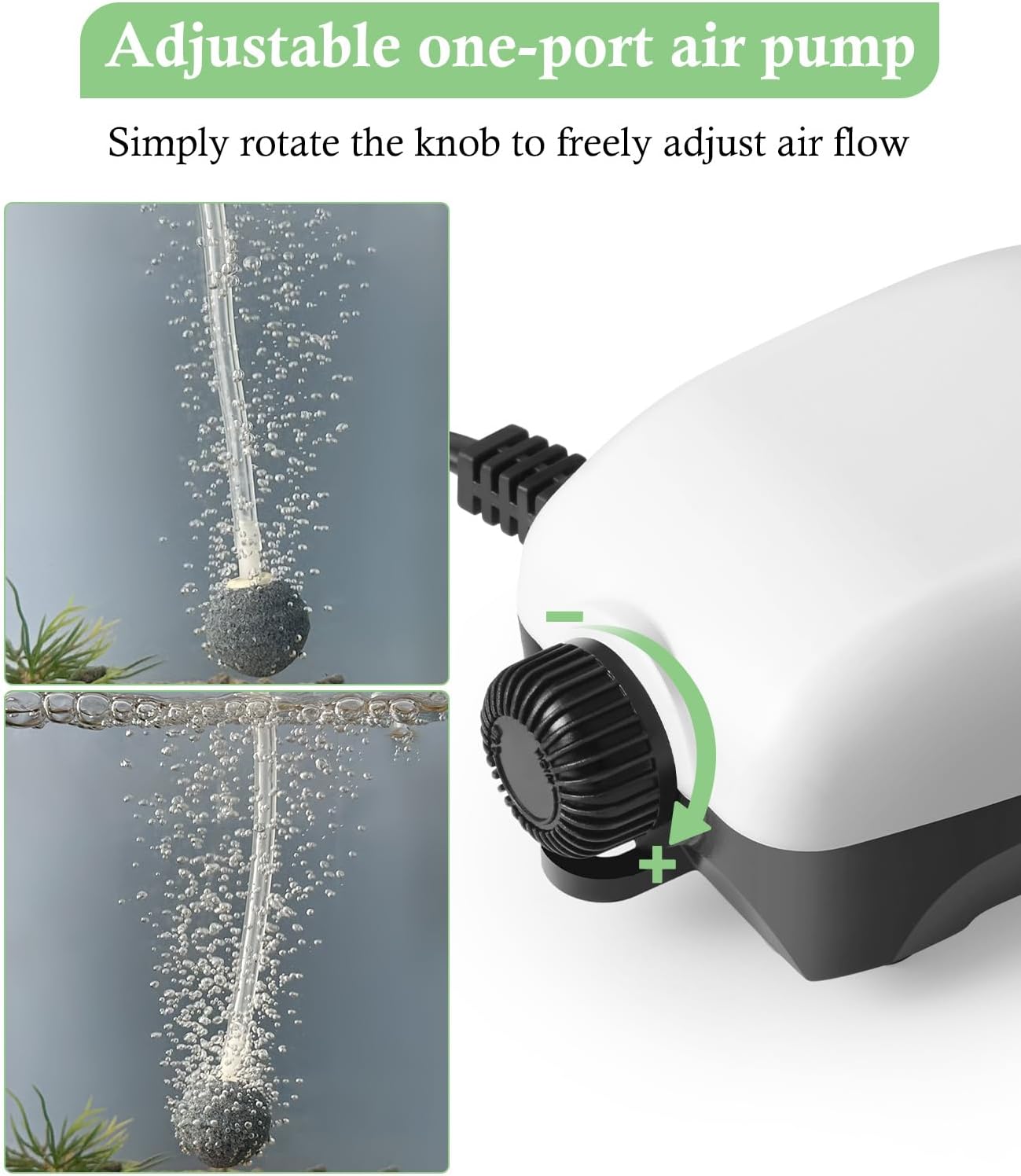 Adjustable Air Flow: Unlike other single outlet air pump aquarium, you can rotate the knob on this air pump to adjust the air volume of this aquarium bubbler easily, which makes this air pump much more convenient to use, providing the appropriate amount of air bubbles for different kinds of fish.