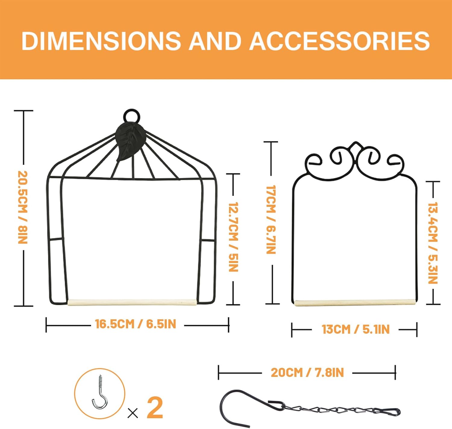 Dimensions of the hummingbird perch: The dimensions of the three hummingbird swing are 5.11*6.7 inches, 6.5*8 inches, and they also come with three chains with S hooks, you can hang the bird swing and provide a natural and comfortable habitat for the birds