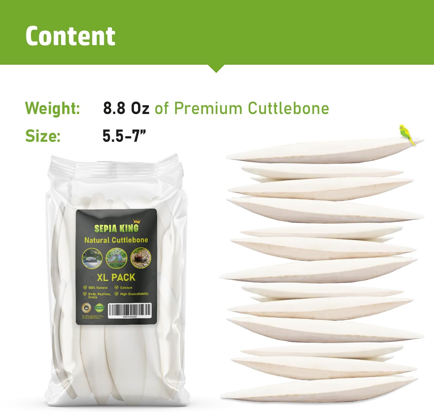 1 BOX = 8.5oz – 100% NATURAL – Sepia King Cuttle Bone is a 100% natural source of minerals and calcium for birds, reptiles and snails. Source of calcium carbonate without any synthetics! Healthy treat and grinding stone substitute.