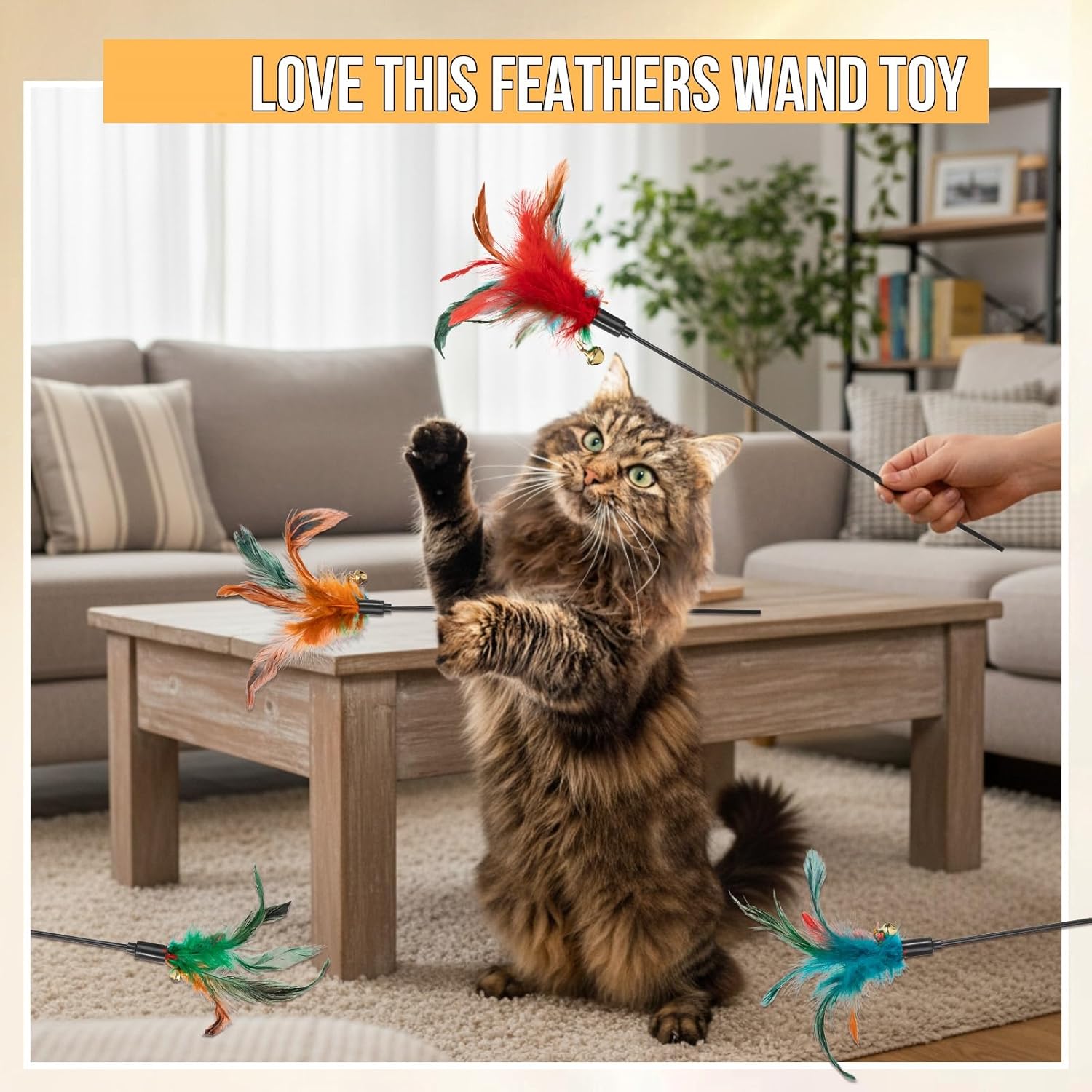 Engaging Bell Feature: each cat wand toy includes a bell designed to easily catch your cat’s attention; Its alluring sound makes your indoor toys more stimulating and encourages your pet to engage longer, improving their agility and alertness
