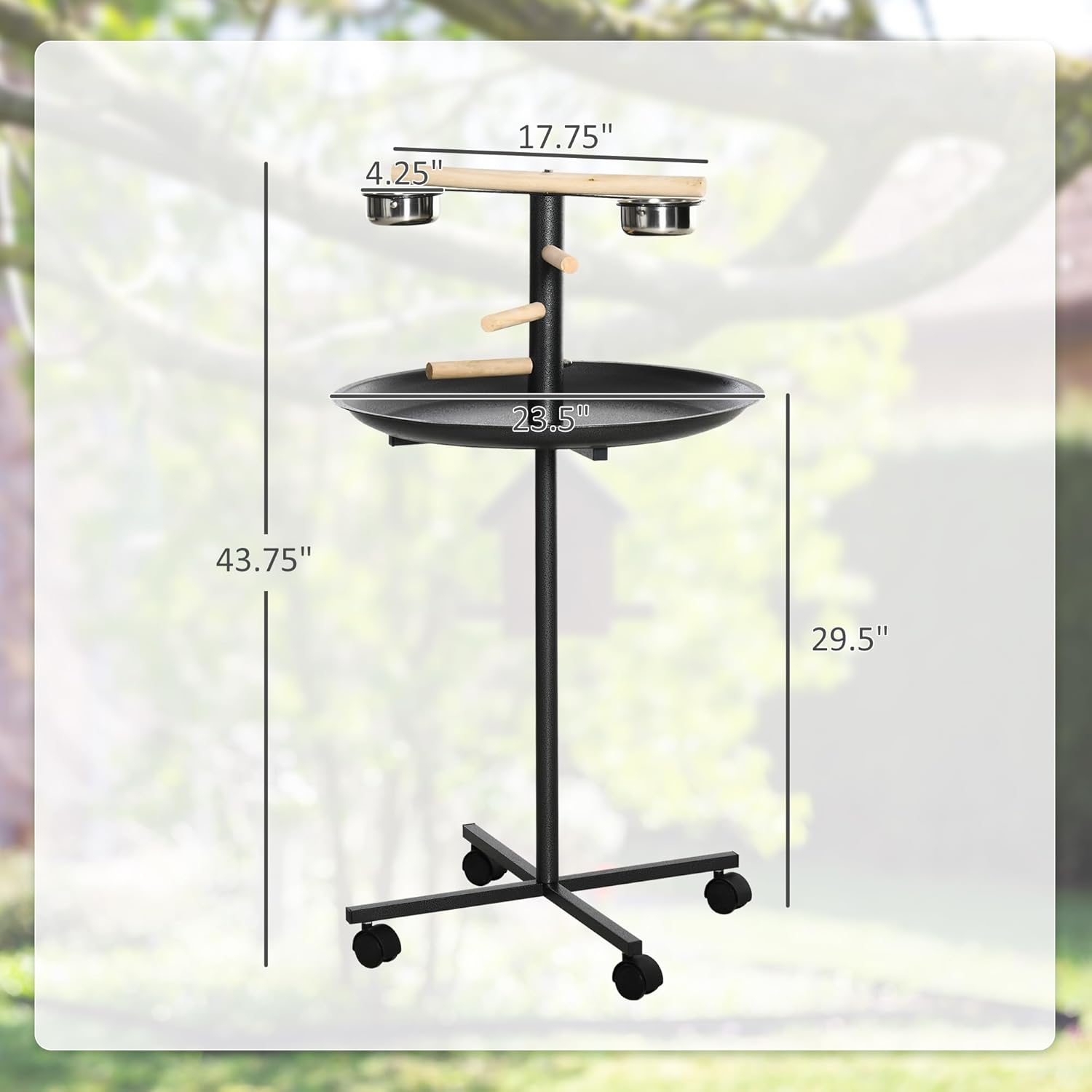 PawHut Bird Play Stand, Portable Parrot Perch, Bird Feeder Station, with Four Wheels, Stainless Steel Feeding Bowls, Round Tray, Grey