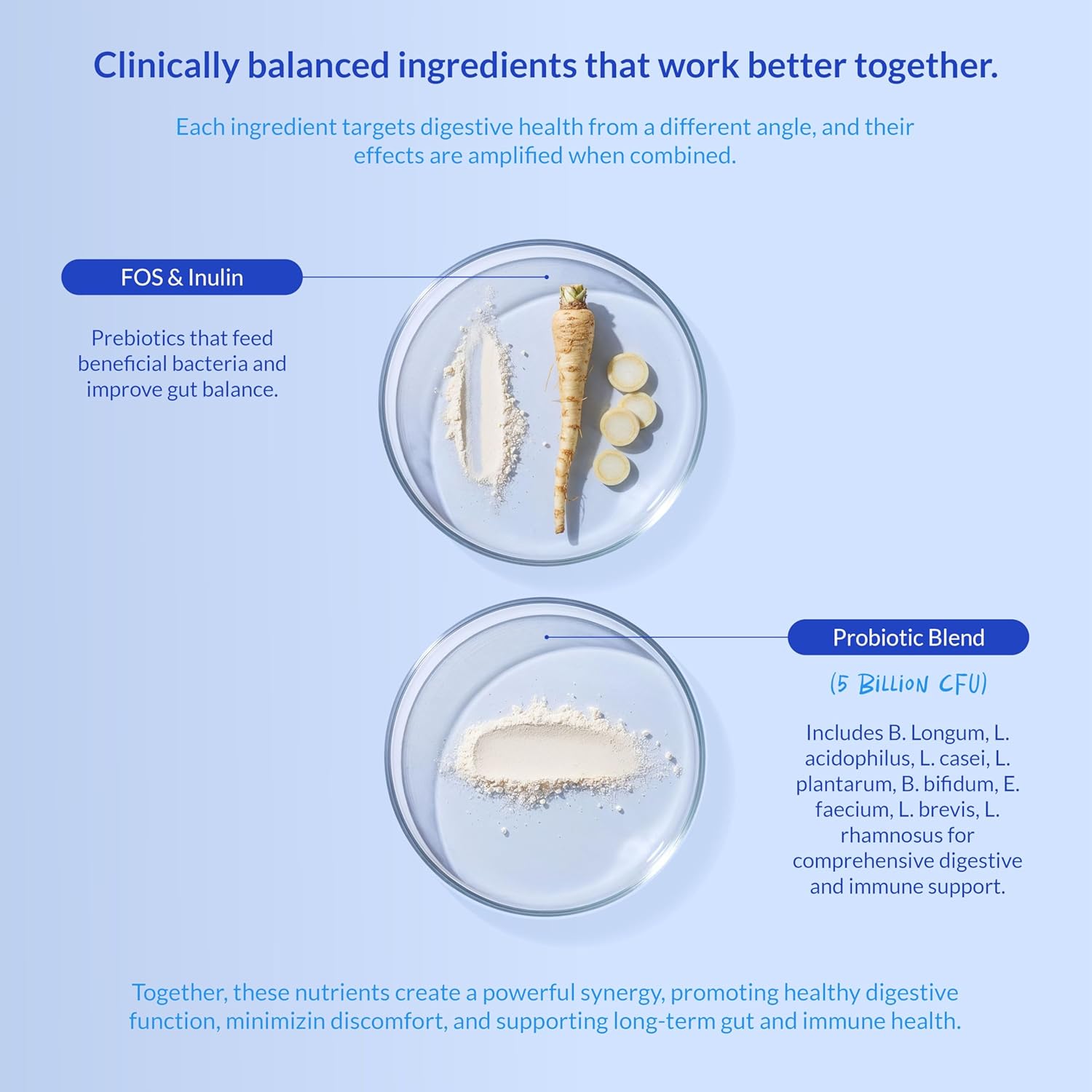 Includes prebiotic support Fructooligosaccharides (Inulin) act as a prebiotic fiber, feeding the beneficial bacteria in the gut to help them flourish and colonize effectively.