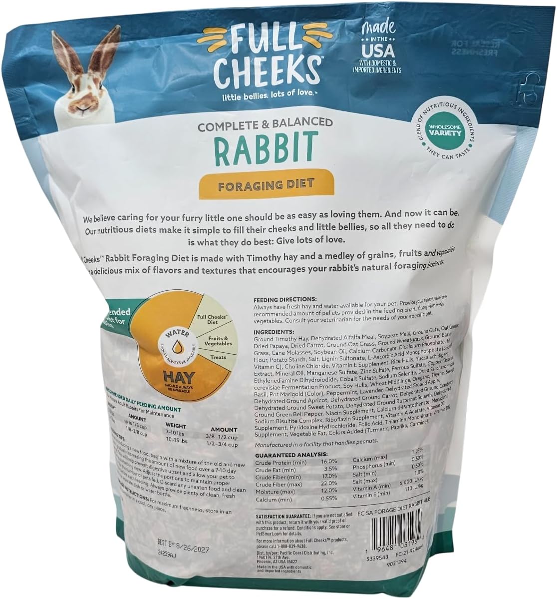 The back of the 4 pound bag includes feeding instructions for your small animal. Provide your rabbit with the recommended amount of pellets and fresh vegetables.