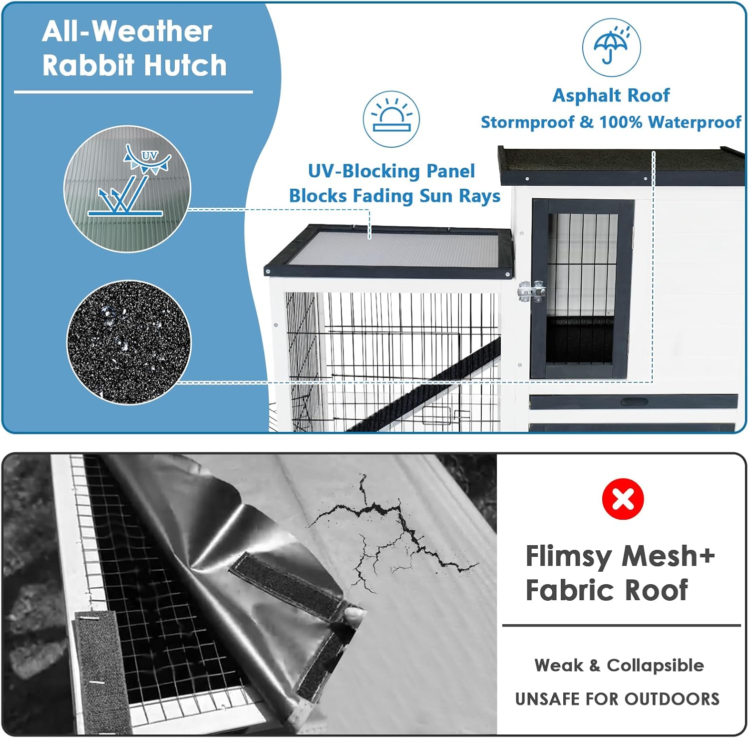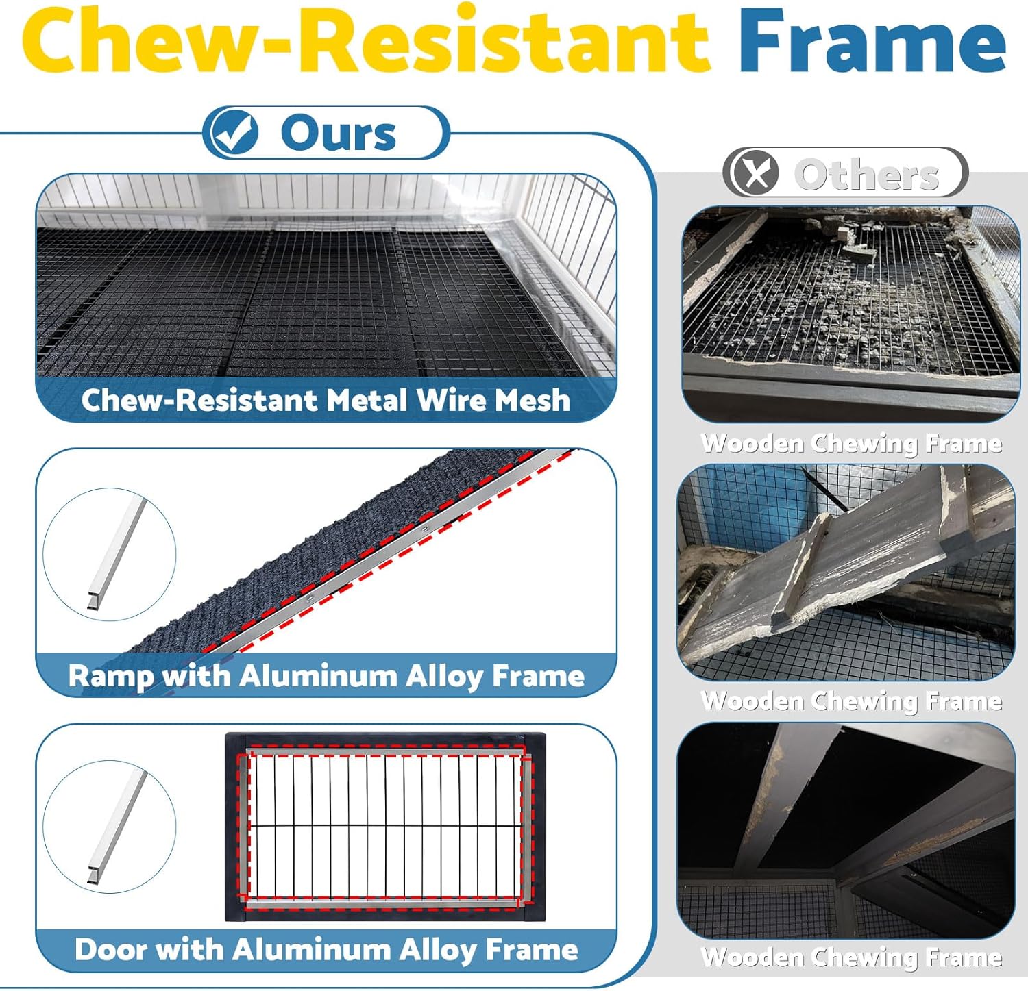 Chew-Resistant Design: Features bottom wire mesh above the lower tray and aluminum alloy frames with ramp & entrance to reduce chewing. Note: While significantly reducing damage, no bunny cage is 100% chew-proof—choose based on your rabbit’s chewing habits