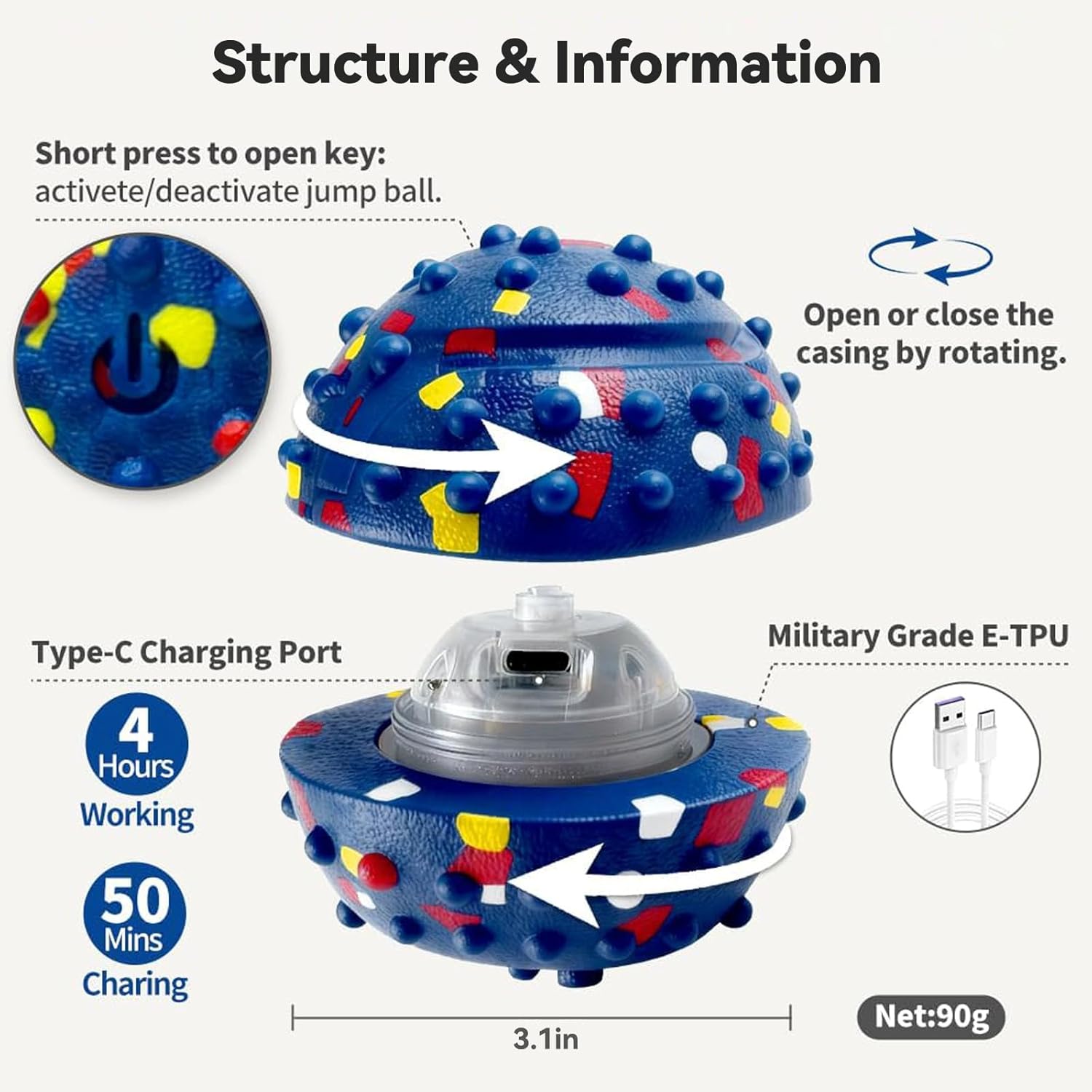 Smart Response & USB-C Charging: When the smart moving dog toy enters sleep mode, a simple press instantly reactivates it for play. Gentle Mode helps it hop and change direction when stuck. By using the Type-C charging cable and charging for 50 minutes, dogs can enjoy up to 4 hours of playtime.