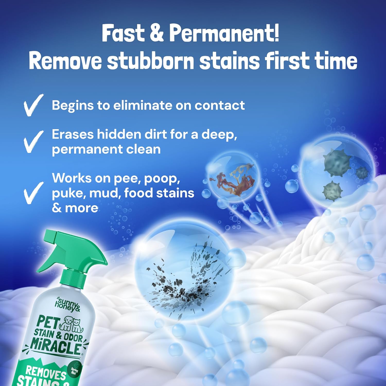 Eliminate Tough, Set-in Stains: Sunny and Honey’s Pet Stain and Odor Miracle removes old and new stains, even vomit and feces. A powerful pet urine enzyme cleaner, it penetrates your rug fibers to permanently destroy stains and surface odors at the source