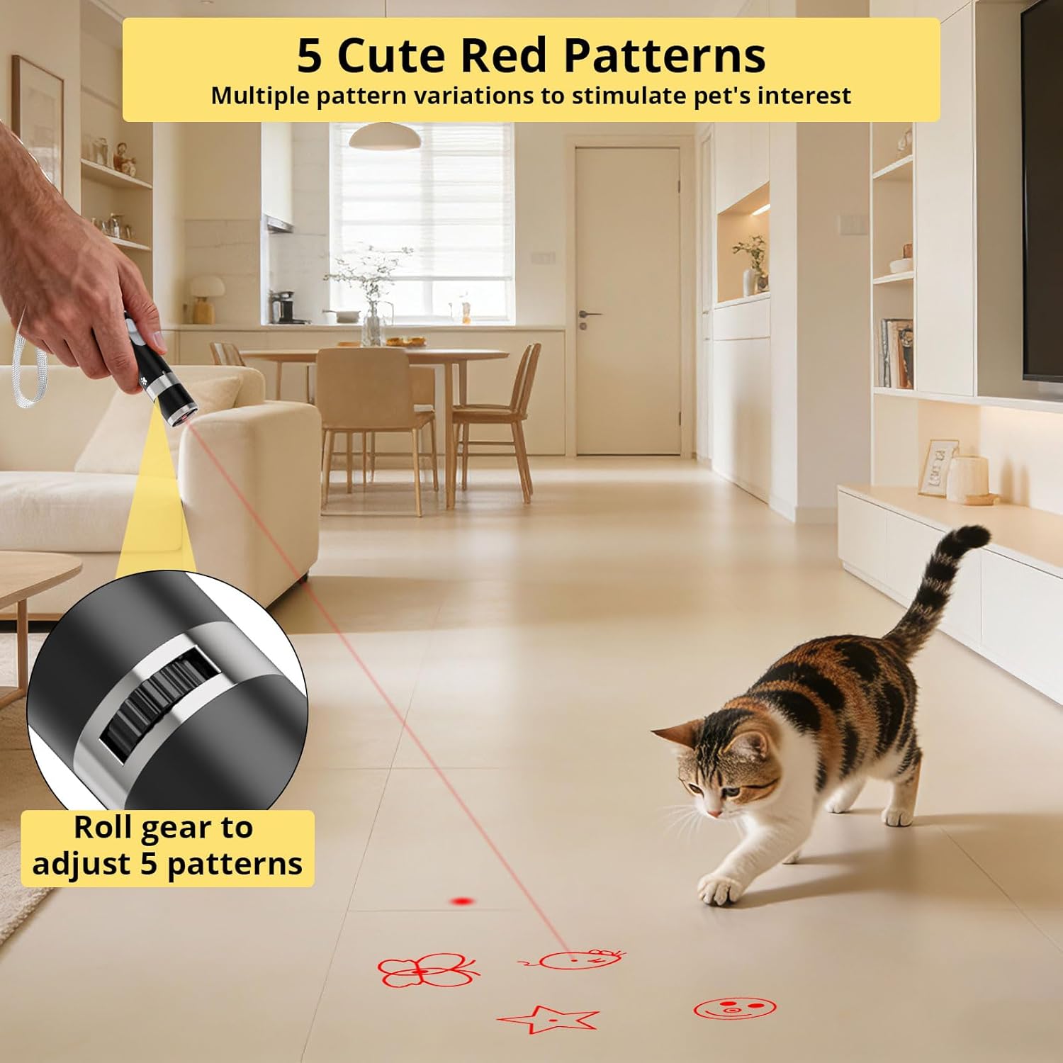 Pet Toys: Easily adjust gears to switch between 5 engaging patterns (dot, butterfly, smiley face, star, mouse) that spark your pet’s curiosity and hunting instincts. Strengthen bond with your through interactive play.