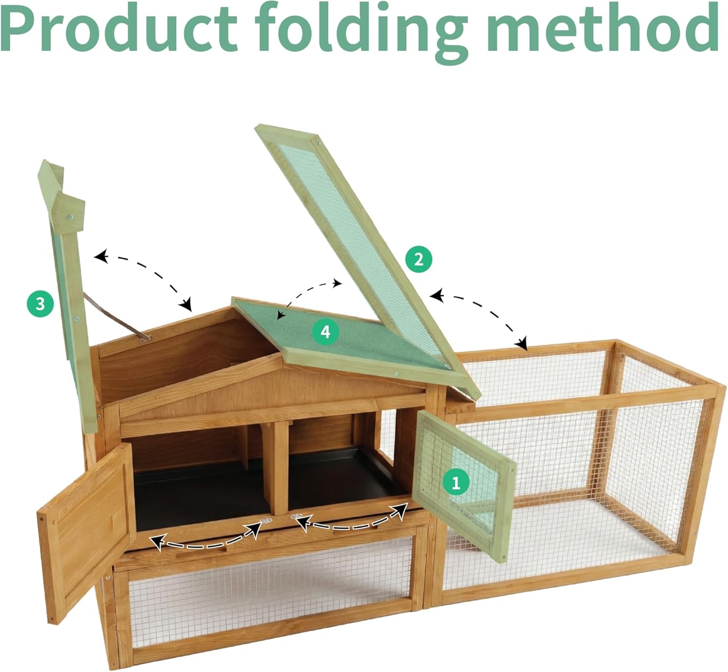 【Easy to Clean and Use】 Our wooden bunny hutch features lockable entry doors and a removable pull-out tray, making it easy to clean. Unlike other ordinary rabbit hutch, our wooden rabbit cage’s trays do not leak, and we have added a locking mechanism to prevent the tray from accidentally falling out. You can use the included cleaning brush for more effective cleaning, ensuring a safe and warm environment for your pets.